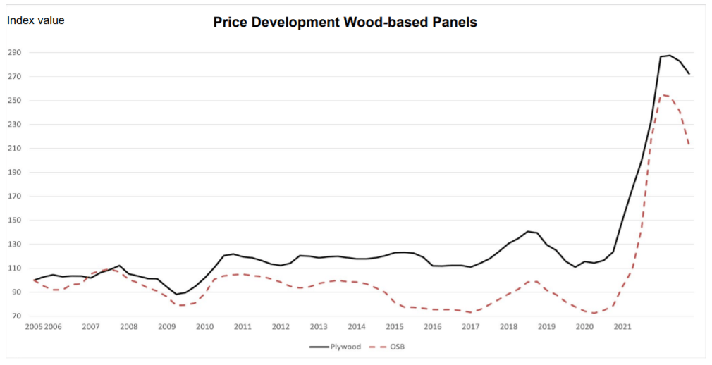 Koka paneļu, piemēram, OSB un saplākšņu cenas samazinās. Tomēr bērza saplākšņu cenas – īpaši no Krievijas – ir stabilas un saglabājas ļoti augstā līmenī, nepietiekamas bērzu apaļkoku pieejamības, piegādes traucējumu un ES antidempinga politikas pret Krievijas ražotājiem dēļ.